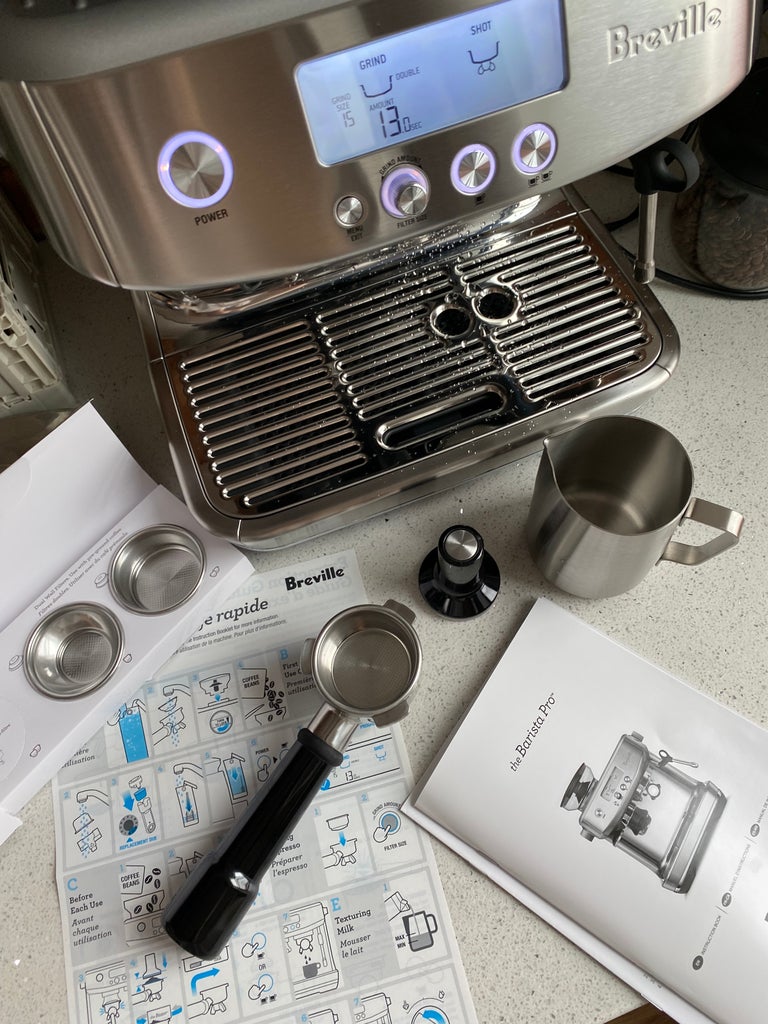 To my surprise, the hardest part of the whole setup process was carrying the box up the four flights of stairs to my apartment. After conquering that harrowing task, I proceeded to unbox the Barista Pro and found so many extras included: a portafilter, tamper, multiple filter baskets, The Razor (Breville’s specially designed trimming tool), a stainless steel milk jug, a cleaning kit, and water filer. After I perused the pretty straightforward instructions, I soaked the water filter, filled the water tank, and went straight to Breville’s Youtube channel to watch some instructional videos before attempting to make my first drink. I decided to stick with the machine’s factory settings, but you can totally customize the grind size, brew temperature, and extraction time based on your preferences and/or what works best with the beans you’re using. There are also options to pull a single shot or a double (I prefer a double).