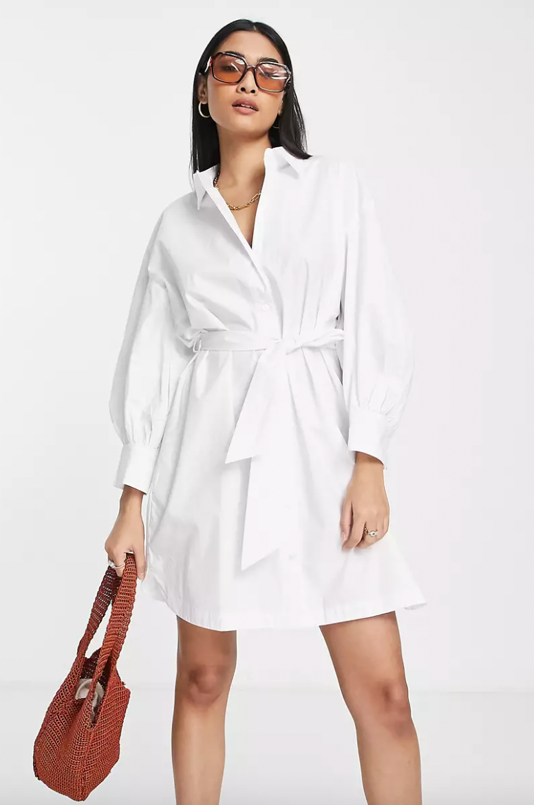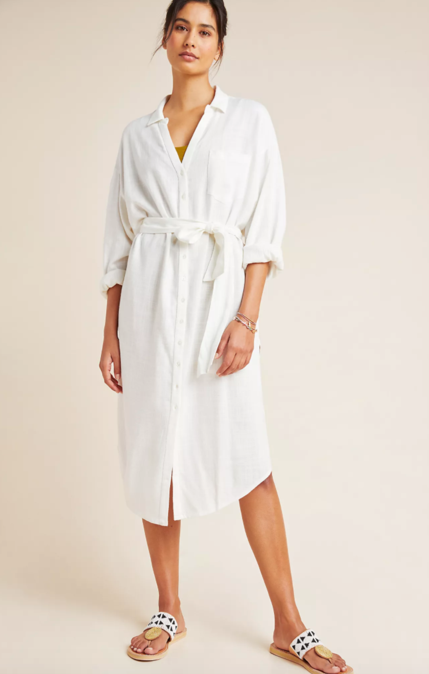 Lightweight and sunlight-reflective, the white shirt dress is a warm-weather staple you can wear (and keep wearing) all the way through Labor Day. Known and loved for its simplicity, the frock is quite literally a no-frills way to be in a dress without feeling dressed up. Don't let the effortlessness fool you, though — this trend is a lot more varied than it sounds. In addition to button-front styles and the classic oversized t-shirt silhouette, there are shirt dresses that can be wrapped, belted, or tied to suit your look. (Pretty much any top that can be lengthened and loosened for the ultimate, carefree summer vibe counts.) The little black dress may forever maintain its tight grip on the evening wear-essentials category — but, when it comes to easy-breezy summer attire, the shirt dress reigns supreme.