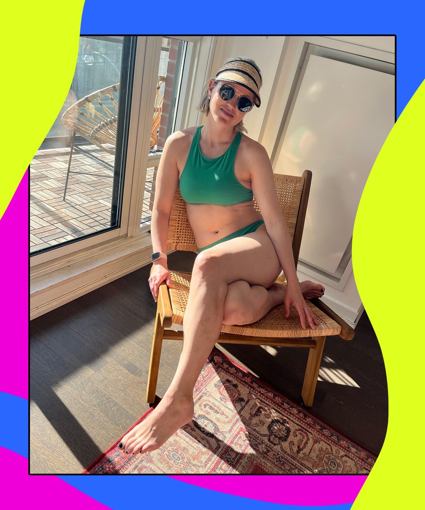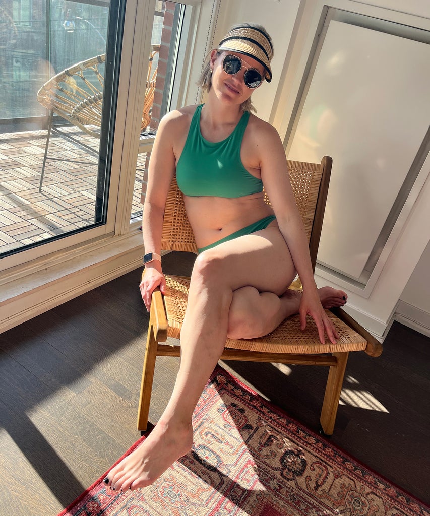 Unlike traditional halters, Aritzia’s version features thinner straps in the back and is lower cut on the side of the bust, so the perfect amount of side boob pokes out. I wanted a little more coverage on my high-leg bottom, so I sized up to a large, which made me feel a bit more comfortable as this is, I repeat, a very high-cut bikini. Also worth noting: The suits are made of recycled nylon and elastane and contain 50+ Ultraviolet Protection Factor.