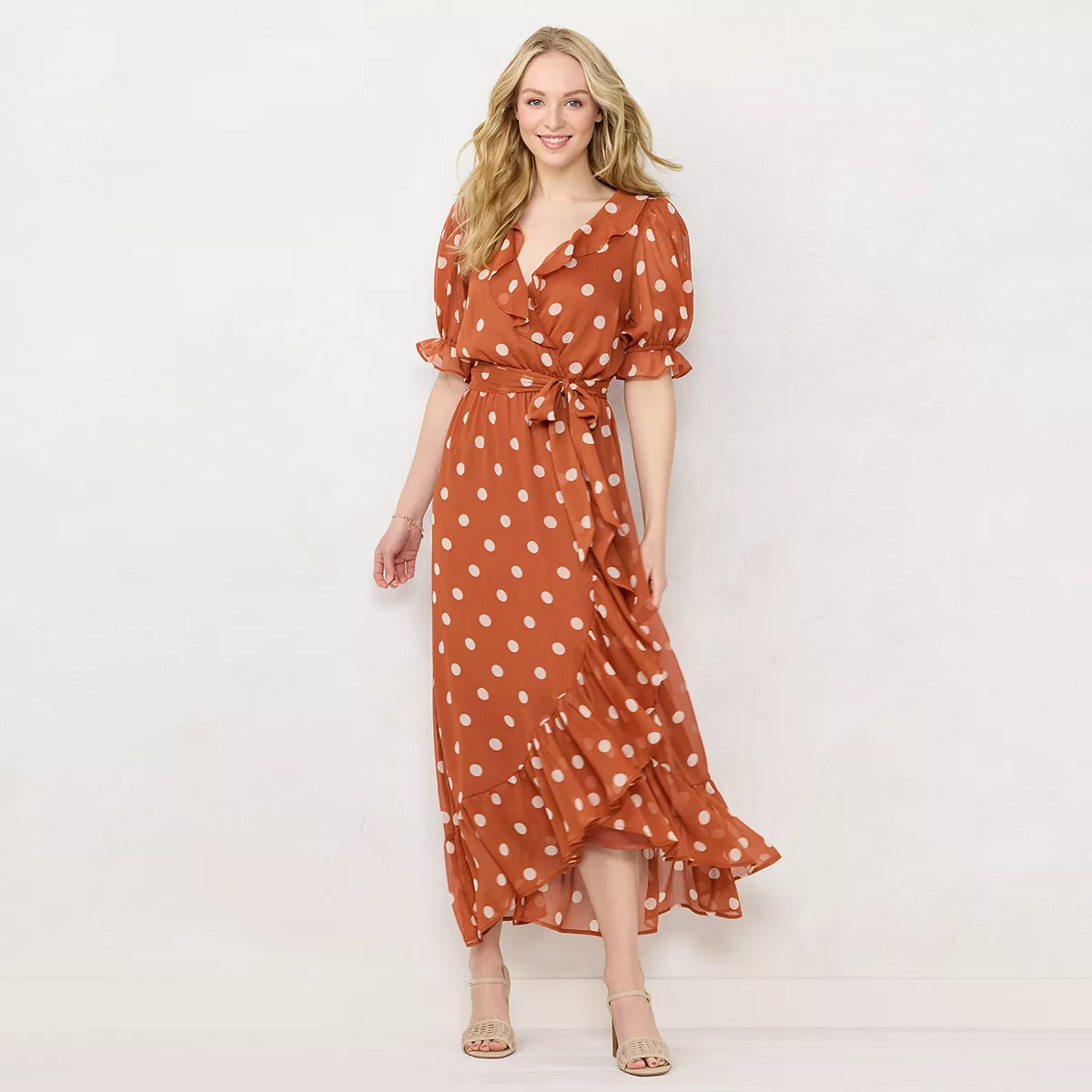 LC Lauren Conrad Polka-Dot Ruffle Faux-Wrap Dress, $, available at Kohl's