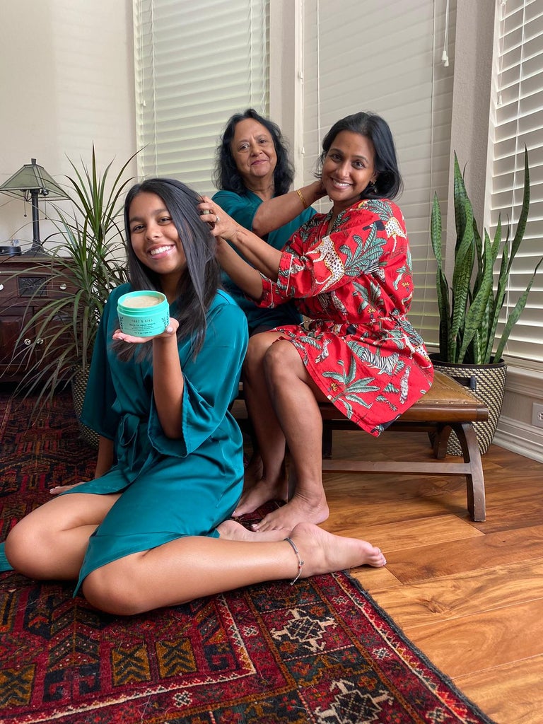 In India, champi, or ritual hair massage, served as a beautiful experience for Chaudhuri and her sister (the Shaz half of Shaz & Kiks) to share with their mother and grandmother. “We’d all sit around in the morning and Grandma would create a hair-oil mask that we’d put on dry hair before doing the wash routine,” she says. “I can still close my eyes and remember my grandmother’s fingers on my scalp and in my hair.”