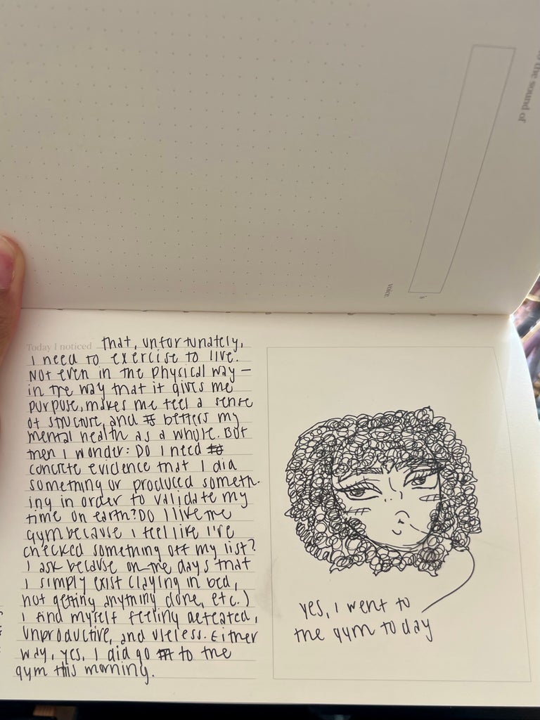 Every page keeps me on my toes, which is most likely why, at the very least, I doodle in it once a day. One page has dotted lines, the next is completely blank, another page has a daunting empty box accompanied by a few lines, and the list goes on. Plus, there are no rules. I’d go as far as to say the journal is a tad unhinged. I asked myself, “Am I supposed to doodle here?” Soon I remembered it was my journal and I can use it however I’d like.