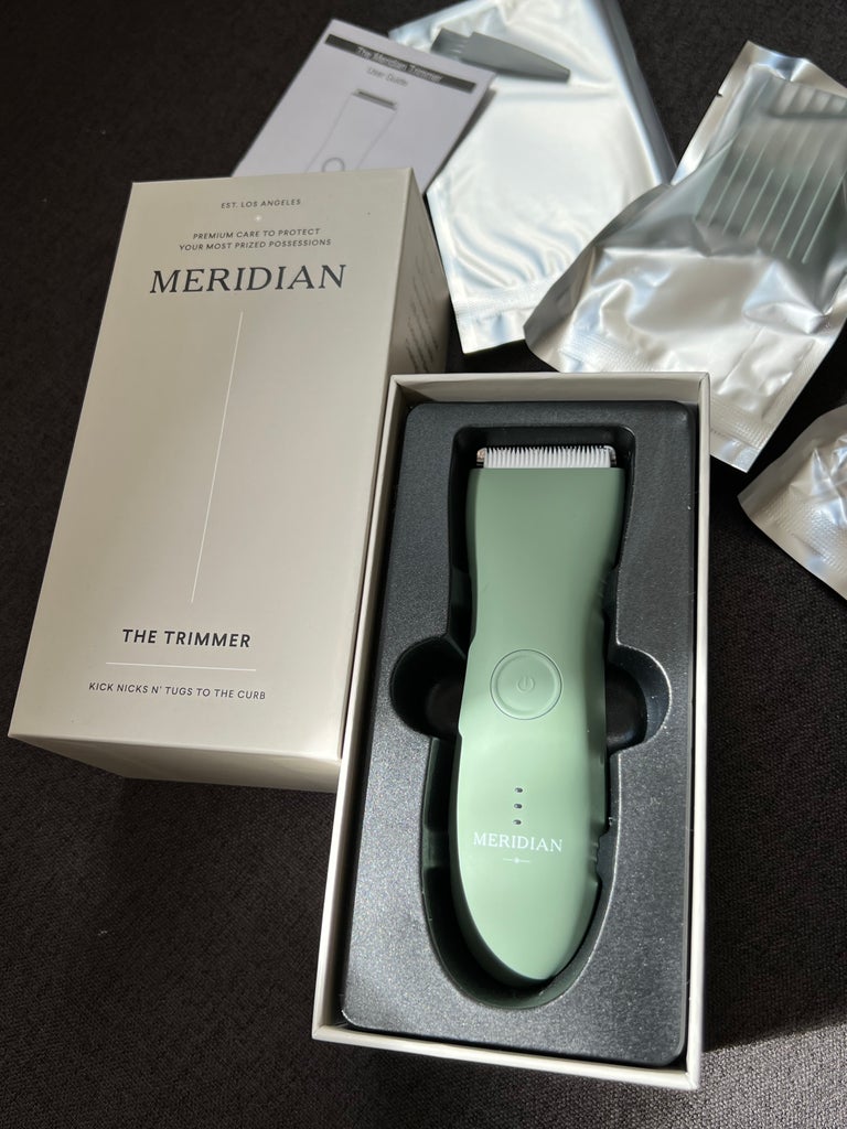 As an electric trimmer novice, I did some research. I deduced that the average groin groomer lands anywhere between $30 to over $100, and the ones worth your time are waterproof, rechargeable, easy to maneuver, and come with some helpful accessories. Not only that, but many brands boast some form of skin-protecting technology that prevents nicks, bumps, and guarantees hygienic safety. Meridian Grooming’s $74 trimmer checks all of these boxes — mine came charged in mint condition and was accompanied by two adjustable guide combs, a cleaning brush, and a USB charger. As for the guarantees, per Meridian Grooming’s on-site description, the gadget’s ceramic blades should “[handle] coarse and curly hair without painful nicks and pulling,” while the adjustable combs ensure you achieve “your perfect length.”