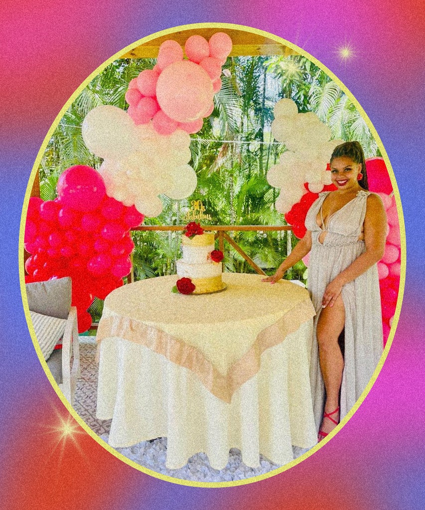 Fifteen years later, she teamed up with her mom and cousin to host her doble quinceañera in the Dominican Republic, where her extended family still lives. Duran, her parents, and her 4-year old son booked their flights in March 2022, with the party slated for June. “My cousin said, ‘There’s a DJ who’s always at this Airbnb in DR, you should check that place out,” she says. She booked the Airbnb, which ended up being the largest expense for the party. Other family members helped transform it into the venue of her dreams, complete with buffet-style food, a tiered cake, and even a balloon arch. “My uncle does balloons, and he made an arch as my gift,” she says with a laugh. “It was super clutch.”