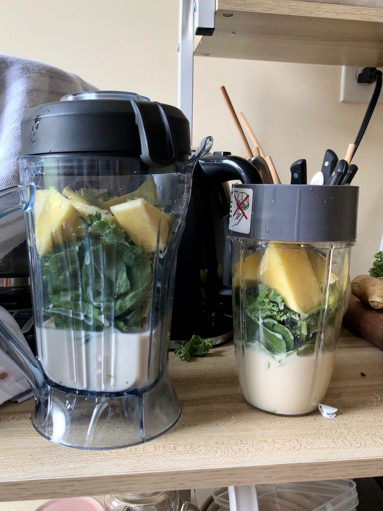 The Results: Surprisingly, the NutriBullet successfully crafted my go-to frozen berry smoothie in 1 minute and 2 seconds, while the Vitamix took about 1 minute and 28 seconds — not counting the extra time I needed to tamper the ingredients into the Vitamix’s blades. In the end, both smoothies tasted great and I couldn’t tell too much of a difference between textures like with the green smoothie. I had to add more oat milk to my Vitamix blend to keep it running (you can tell it’s lighter on the right), and the cleanup was more difficult with the ONE, so the NutriBullet Pro takes the cake in round two.