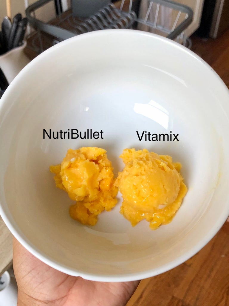 The Results: At the end of the round, the last man standing was the ONE. I now understand why people dish out the big bucks on these fancy gadgets and why they surpass cheaper options. After about four repeated blends and shakes with my Nutribullet, I gave up on trying to achieve the creamy texture I got with the Vitamix. I took a spoonful from each, and you can see the smoothness of the Vitamix scoop in comparison to the still chunky scoop on the left.