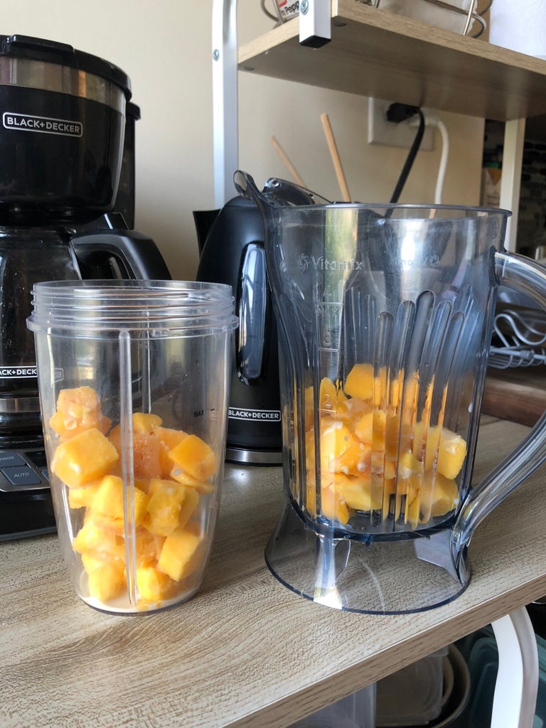 The final, and the most telling test was frozen mango chunks. I learned that this was a tried & true way to tell the capabilities of your blender so, I scooped about a cup and a half into each, about a tablespoon of oat milk, and let it rip.
