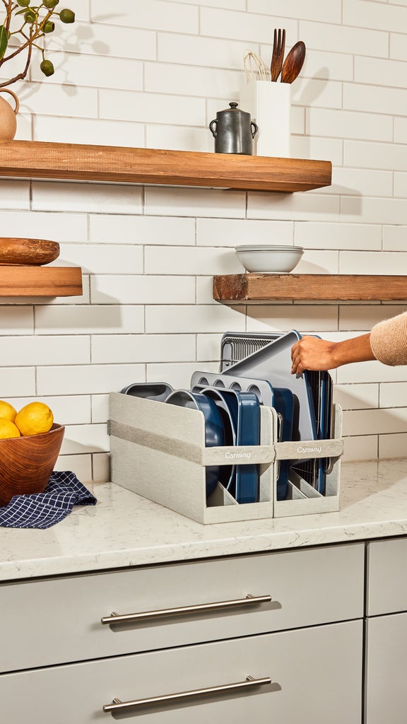 The Bakeware Set is the Cookware Set’s fraternal twin — they’re comparable in both functionality and composition. For $395 (also a $545 value) you get an 18-x-30” Baking Sheet, 10-x-15” Baking Sheet, 12-cup Muffin Pan, 9-x-13” Rectangular Pan, 18-x-13” Cooling Rack, 9” Square Pan, 1 lb. Loaf Pan, and two 9” Circle Pans. Plus — it wouldn’t be a Caraway set without the included storage — you receive two storage racks with your purchase. All coatings are similar to the cookware with their nontoxic, mineral-based ceramic materials. There’s also a cheaper, 5-piece set available that’s equipped with only one magnetic rack. Our previous deputy director tested them last year and declared, “Caraway’s bakeware bundle makes me feel like a Gen-Z Martha Stewart.”
