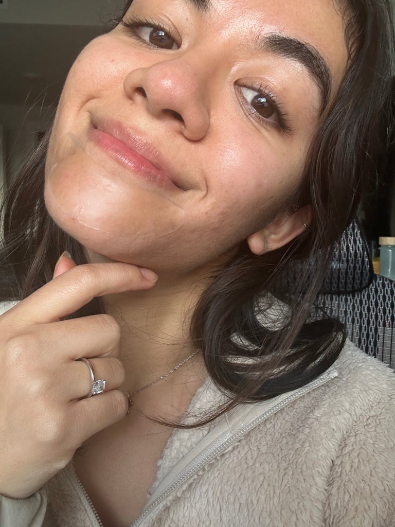 I’ve long used the brand’s XL Mighty Patch Surface patches before to address clusters of whiteheads and clogged pores on my jawline and chin, and listen: They work, but even I’ll admit that the fit is far from a 10/10. “Surface is great when you have a large, flat area,” explains Rhyu. “So a lot of time was spent understanding the curves of the chin area and really finding the right places to have those indentations [in the patch], so it wouldn’t get all wrinkled when you apply it.” Fourteen iterations later, they arrived at the Mighty Patch Chin sticker I’m wearing below. From far away (and if you’re as nearsighted as I am), you almost can’t notice that I have a large, clear patch on my face. The finish is a sheer, soft matte that blends into the skin pretty well given the size, and as Rhyu mentioned, the notches enable it to hug my chin.