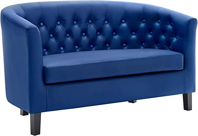 Get your dose of comfort without sacrificing a chic silhouette with this hardwood framed loveseat covered in rich blue high-density foam cushions and upholstery.