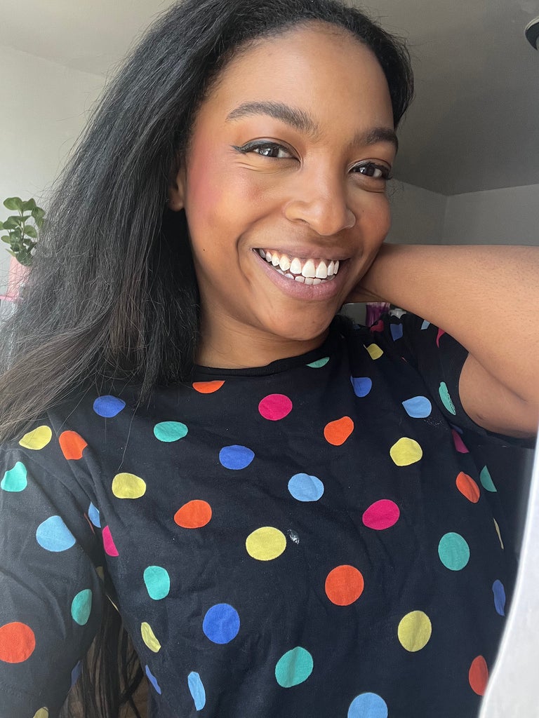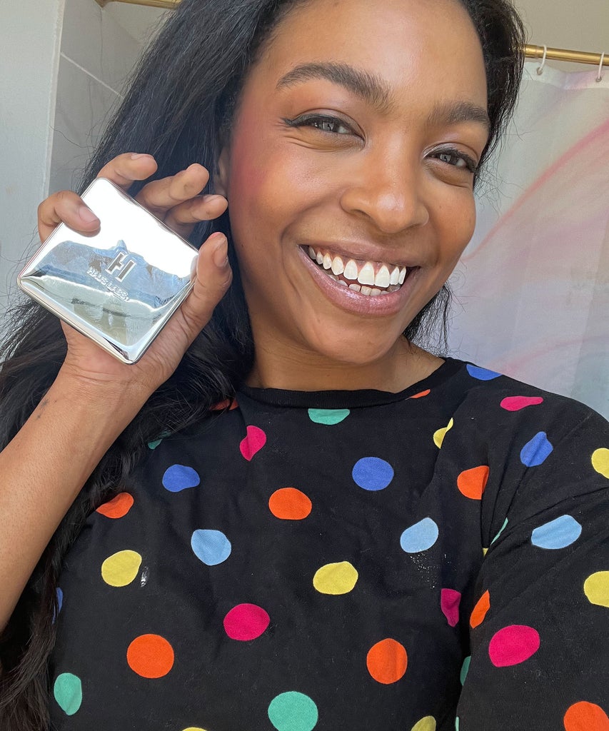 The brand recommends layering the blushes on top of each other for a two-toned look, so I wore Dragon Fruit Daze on the high points of my cheek, blending into my hairline, and layered Pomelo Peach on top, closer to the apple of my cheek for an ombré effect. It was so pretty and the perfect pop of color. I highly recommend using the lightest touch with these, because the pigment is pigmenting for sure, but you can tone down the color with the leftover concealer from your beauty sponge if you find yourself entering Bozo the Clown territory. R29’s deputy beauty director Jacqueline Kilikita tried out the TikTok circle blush trick last week, and I cannot wait to use that technique with these blushes. I’m going to have, and love them, forever. I can’t wait to see how they expand the shade range and when they make the travel-size version.”