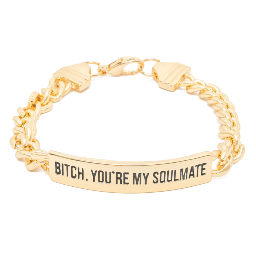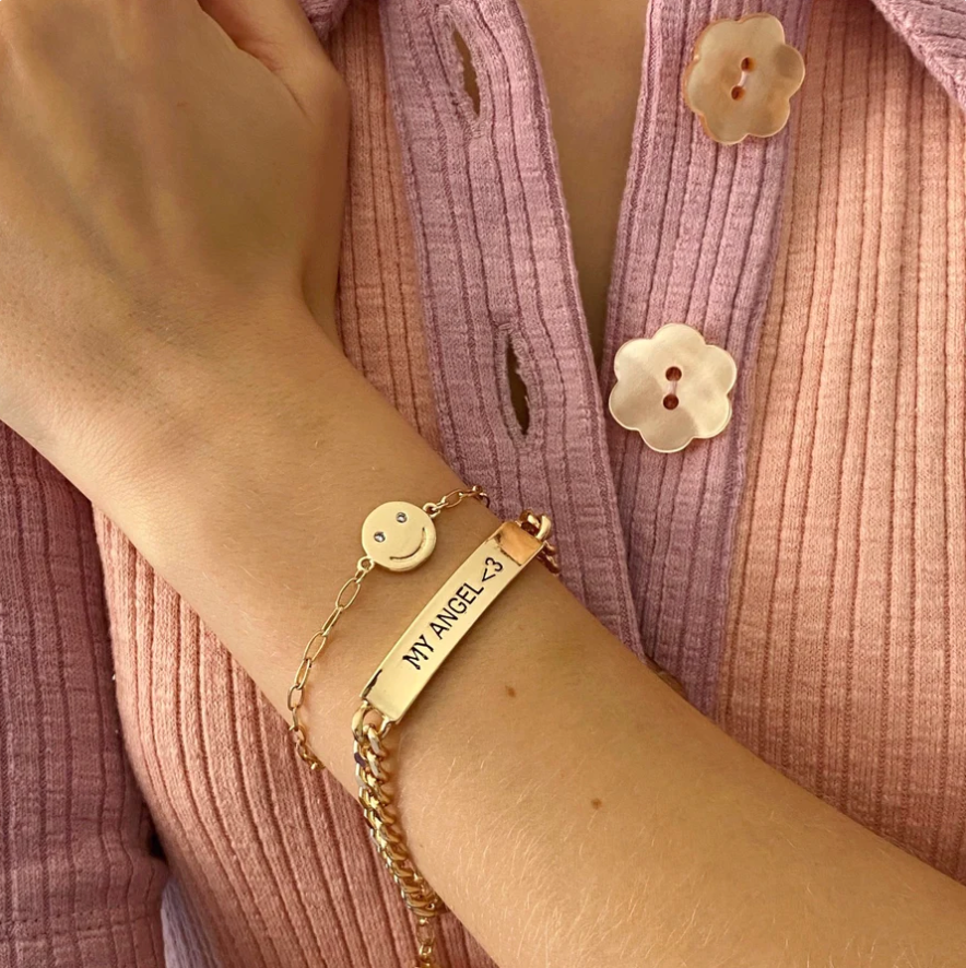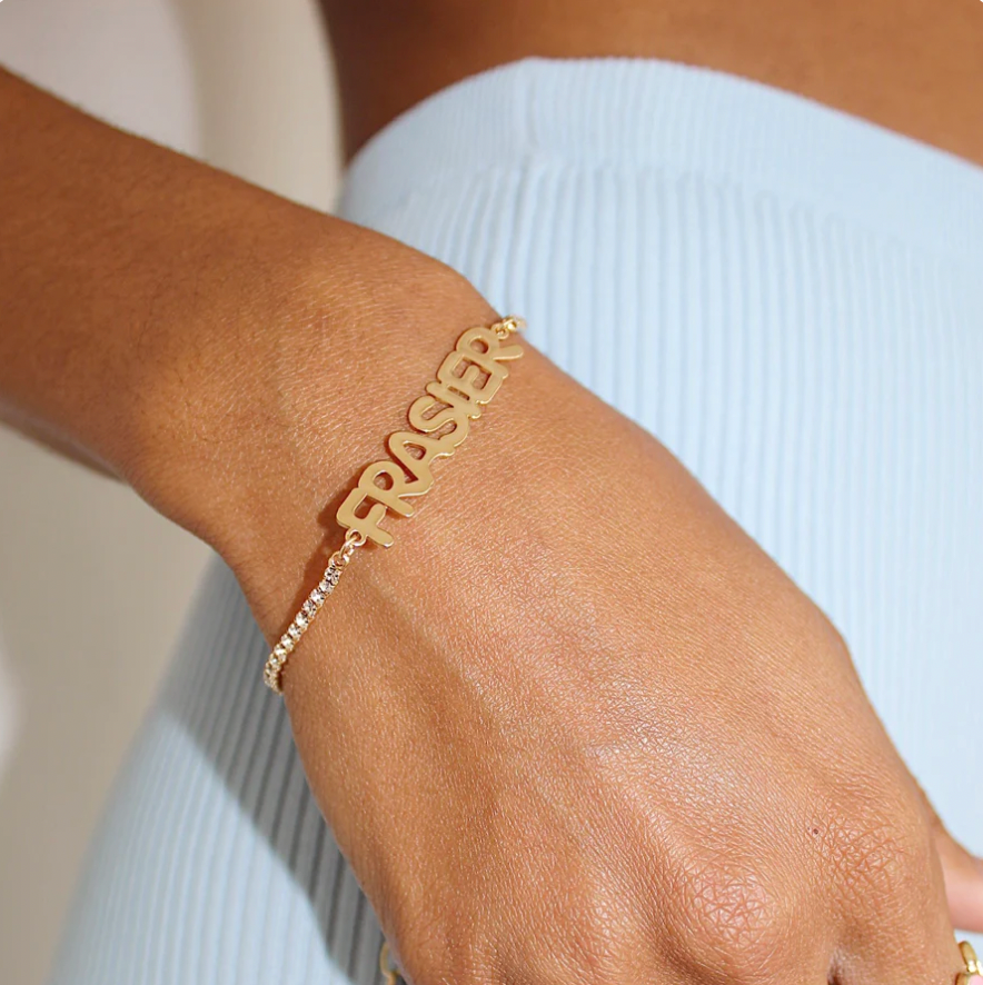 The tongue-in-cheeky, aughts-inspired nameplate designs are at the core of Frasier Sterling's line. Gift your bestie a matching friendship bracelet, or let them know they're your soulmate in the most Y2K way possible.