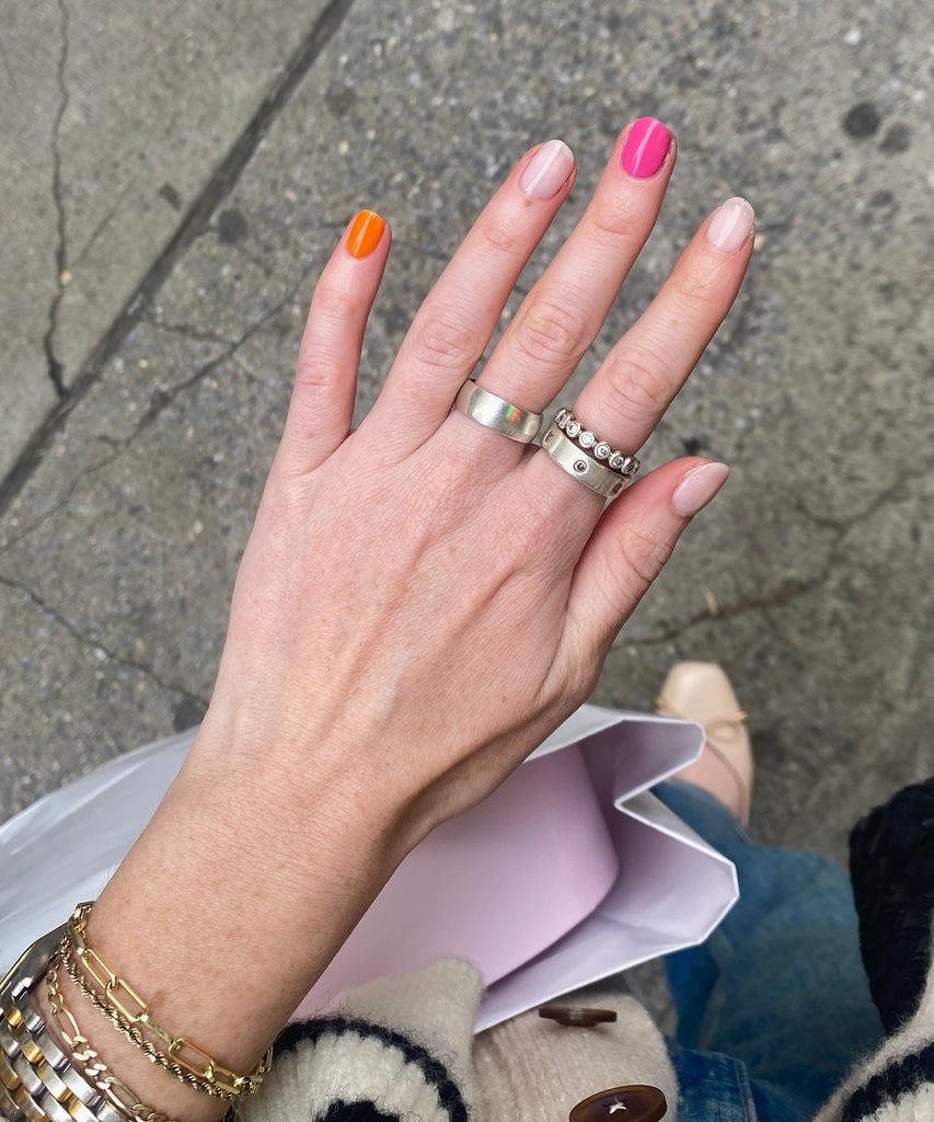 There’s something fun about the low-stakes spontaneity of walking into the nail salon with the intention of getting a quick polish refresh and walking out with a manicure that feels more unique and personalized than the singular red or pink polish in your wheelhouse. In my most recent manicure, I baby stepped out of my comfort zone and threw a few colors into one manicure — and now I’m obsessed with the concept.