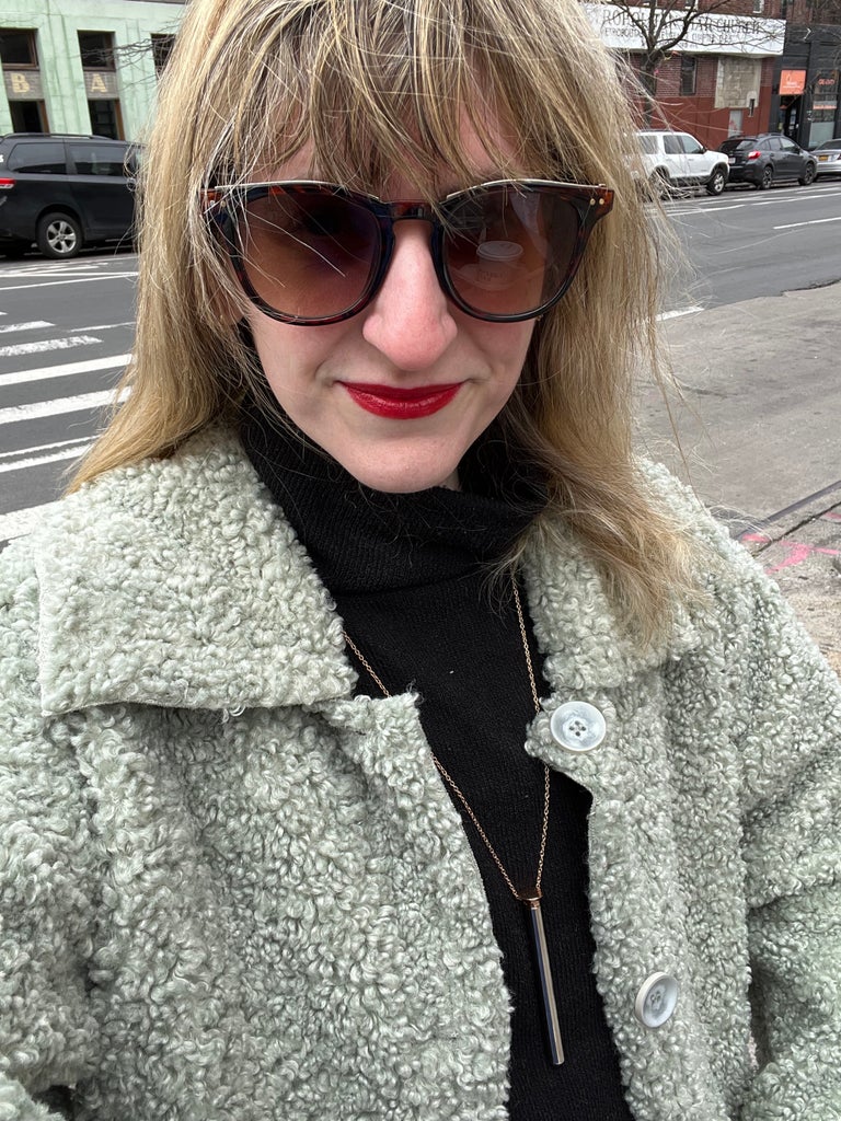 Upon putting the necklace on, I was immediately impressed. It looked… good. There’s a reason this necklace isn’t just available on Amazon, but also at luxury retailers like Nordstrom and even Goop. The bullet, which is about 3.5 inches long and hangs from a 26-inch chain, is available in three elegant finishes: silver, rose gold, and 24k gold (all at differing price points). I chose the rose gold since I already had a similar-looking necklace in silver. Honestly, with my entire outfit, it looked just like a normal piece of trendy jewelry. Even if it didn’t have vibrating capabilities, I could see myself wearing it. That’s because it doesn’t really look like a vibrator at all, hence the appeal.