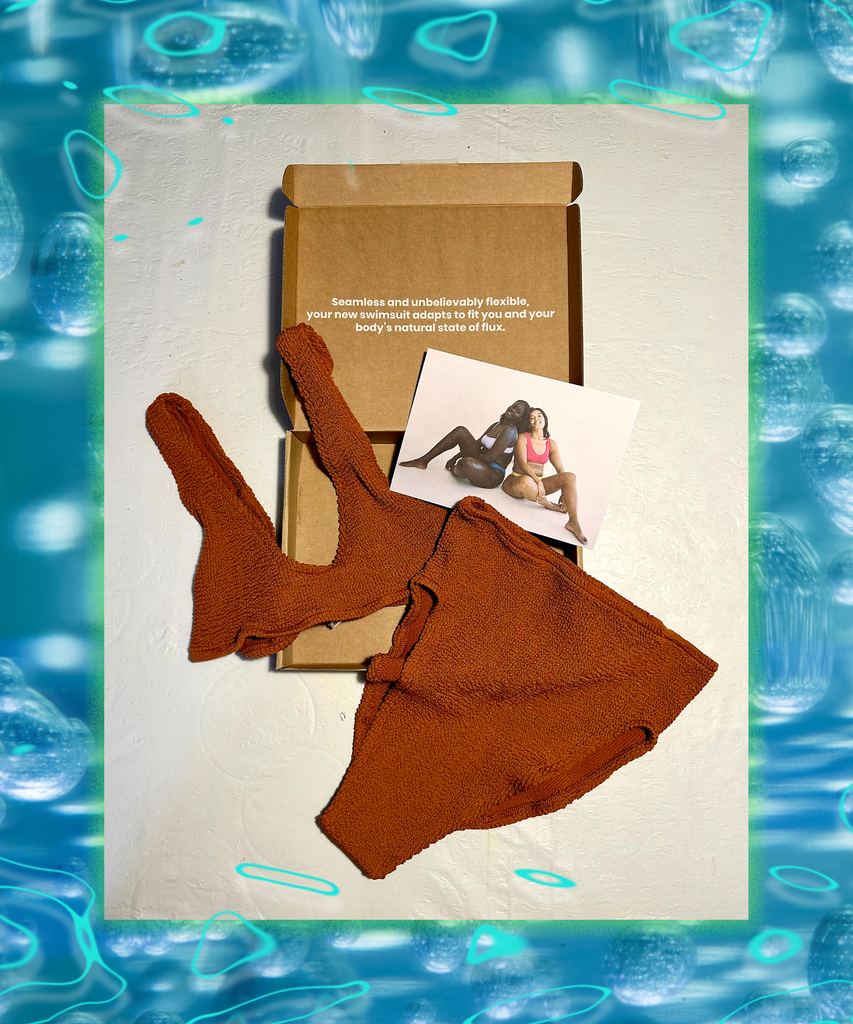 I can fluctuate anywhere between a size 8 and 14 within a year, so I opted for the Eva High Waist Two-Piece in size Stretch I and the Umber colorway (to match my hair, of course). After it arrived in some sleek, sustainable cardboard packaging, I was shocked by how tiny it was. But as I gave the fabric a tug, I realized just how stretchy the material actually is.