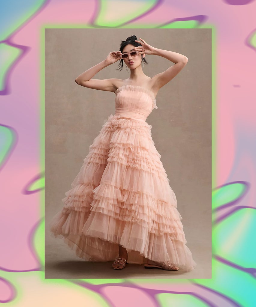 There’s tulle for days but at least the dress is tiered and layered in a nontraditional way. We also love the overall blush hue.