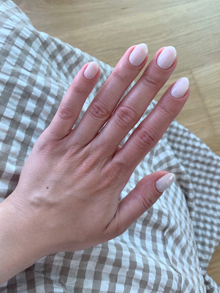 Jen used a minuscule nail brush to build the gel polish in certain areas so that the finish was a tad more uniform, rather than uneven, as can be the case with many sheer gel and regular nail polishes of this hue. That said, this manicure doesn’t have to be perfectly opaque. Much like a milk bath, these nails are meant to be slightly translucent, so even if you do catch a glimpse of your nail bed underneath, it simply adds to the effect. Jen finished off with a top coat, which is the key to achieving the glossy liquid effect of a milk bath.