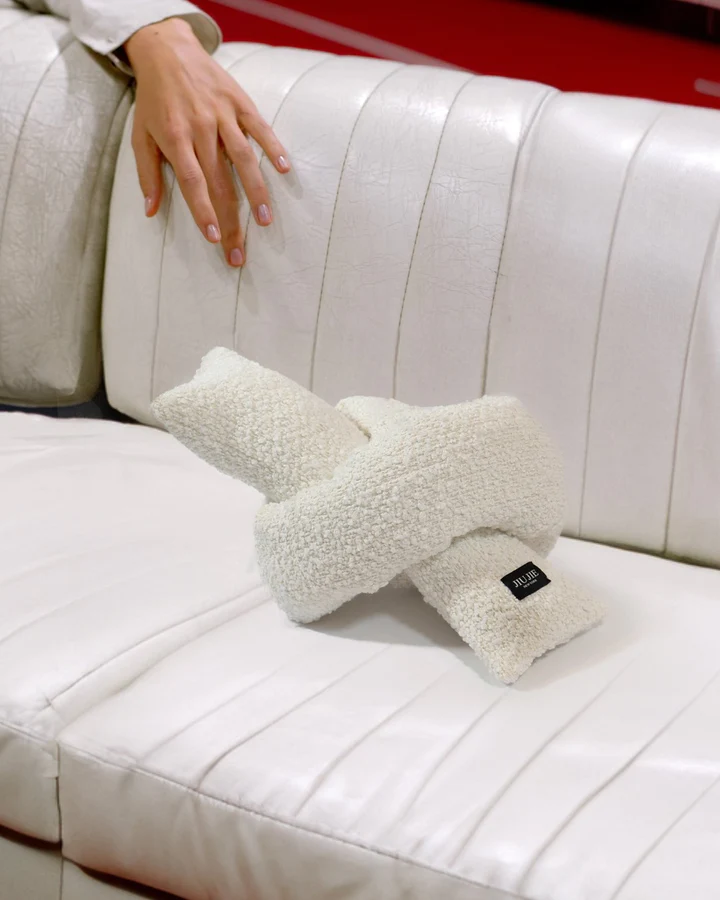 Jiu Jie Angel Boucle Baby Knot Cushion, $, available at Jiu Jie Decor