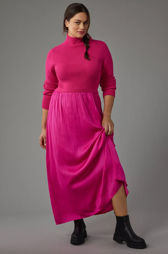 Who doesn’t love a good two-for-one deal? Anthropologie has crafted a one-piece that merges a cropped mock neck sweater with a woven midi skirt for a polished dress that requires no styling.