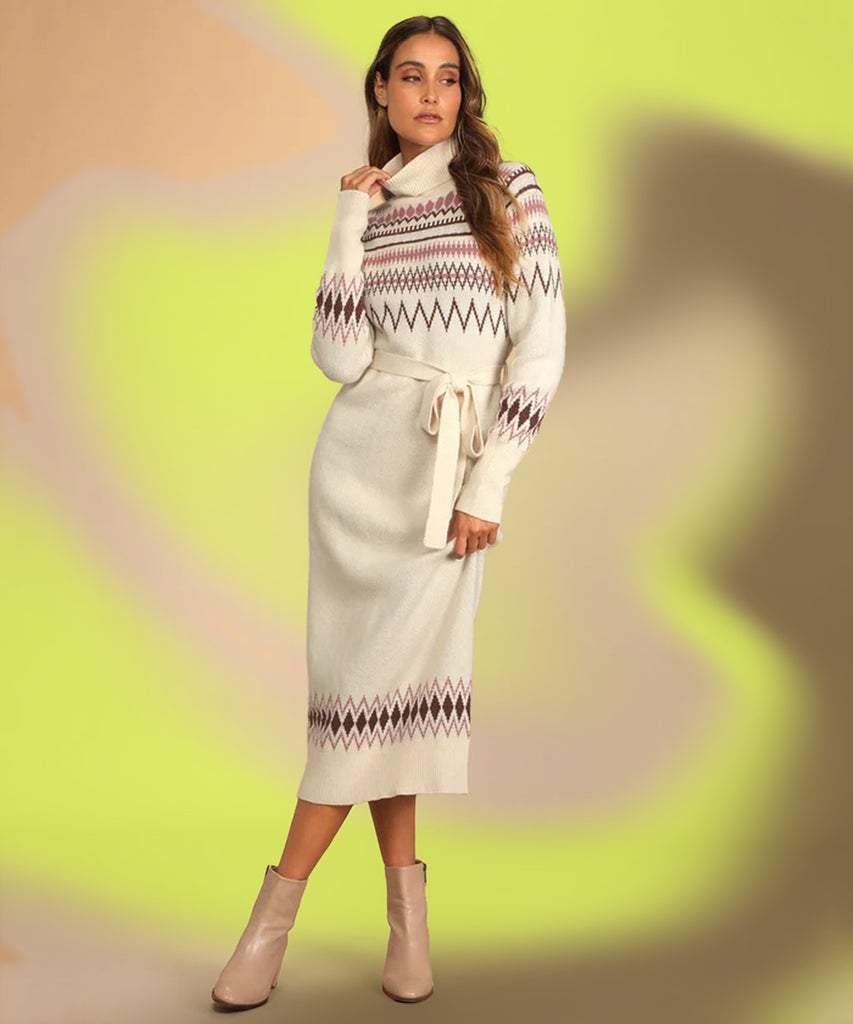 Oversized sweater dresses are the epitome of winter fashion, and if you add a turtleneck with a Fair Isle-inspired print to it, you’re perfectly outfitted for chilly season. This thick, stretch-knit sweater dress has a turtleneck and tying sash belt that keep you extra toasty while adding a bit of chic detailing atop the charming print. Since the dress has a column silhouette, reviewers recommend sizing down.