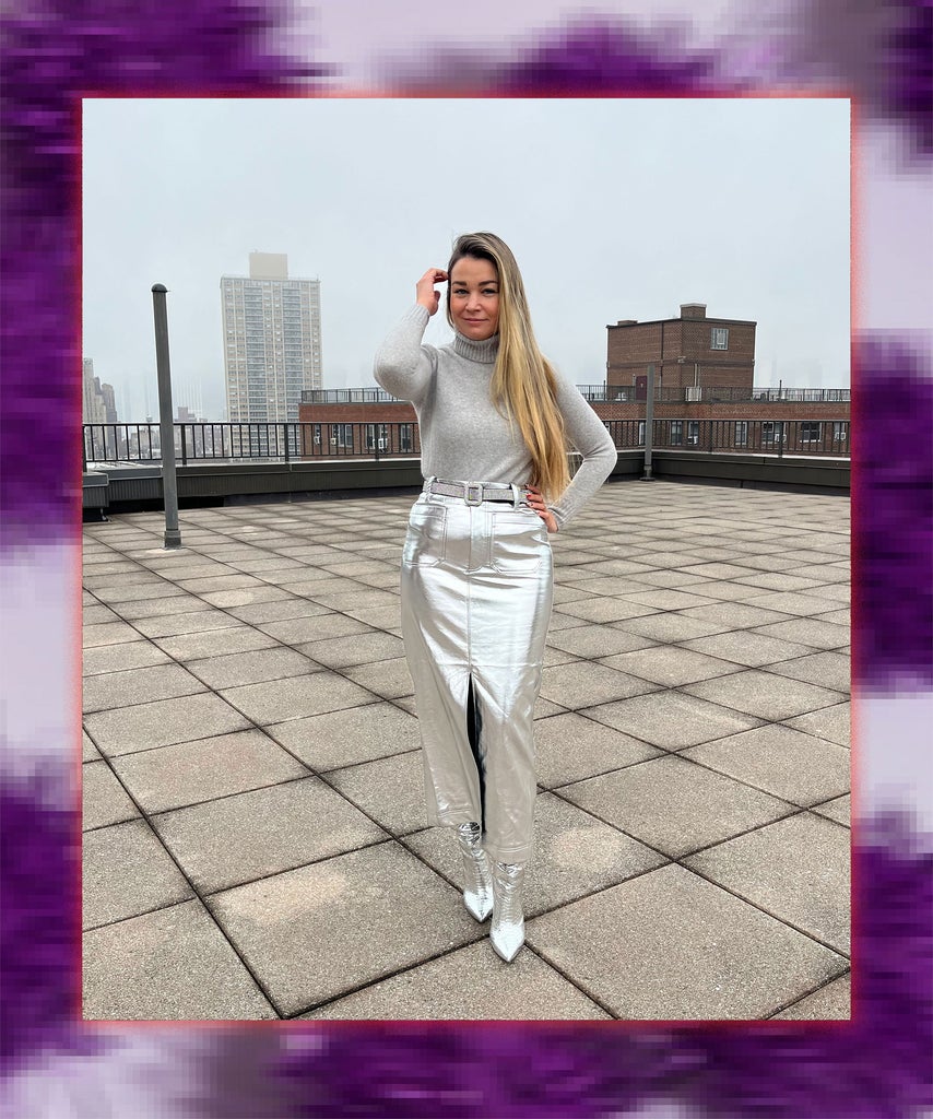 “Thanks to Beyoncé’s Renaissance Tour — and, more recently the Renaissance film — silver metallics are having a moment in fashion. I haven’t been immune to the look, which is perfect for holiday dressing. For a holiday party, I styled this maxi leather skirt, which was true to size in a small, monochromatically with shiny knee-high boots, a crystal belt, and a gray sweater. As a minimalist, I am not big on sequins, so I love how the glossy silver colorway creates a frosty, festive look without making too much of a statement. For a more toned-down look after the clock strikes midnight on December 31, I would style this skirt with a T-shirt and a black blazer or leather jacket.” — Irina Grechko, Fashion Director