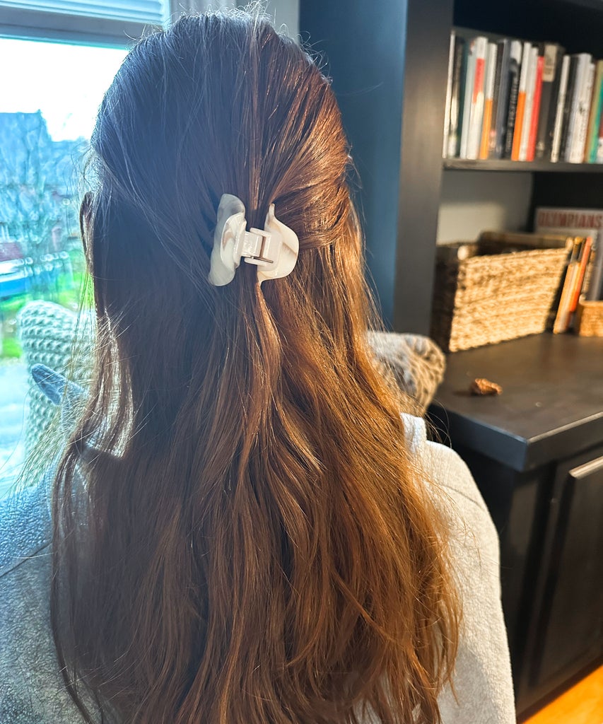 Here’s how I use it: After the shower, I towel-dry my hair with my Volo Hero Microfiber Hair Towel (it absorbs the water immediately) and apply the Dove Scalp+ Hair Therapy Serum to my hairline and down my part. I massage the serum in with my fingers, and it sinks in right away. Zero mess. At this point, I can leave my hair to air dry or use a blow-dry brush when it’s 80% dry. Yung offers another helpful tip on heat styling: “Waiting until the hair is almost dry will help so your hair’s not as fragile.” As we know, brushing wet hair can cause breakage.