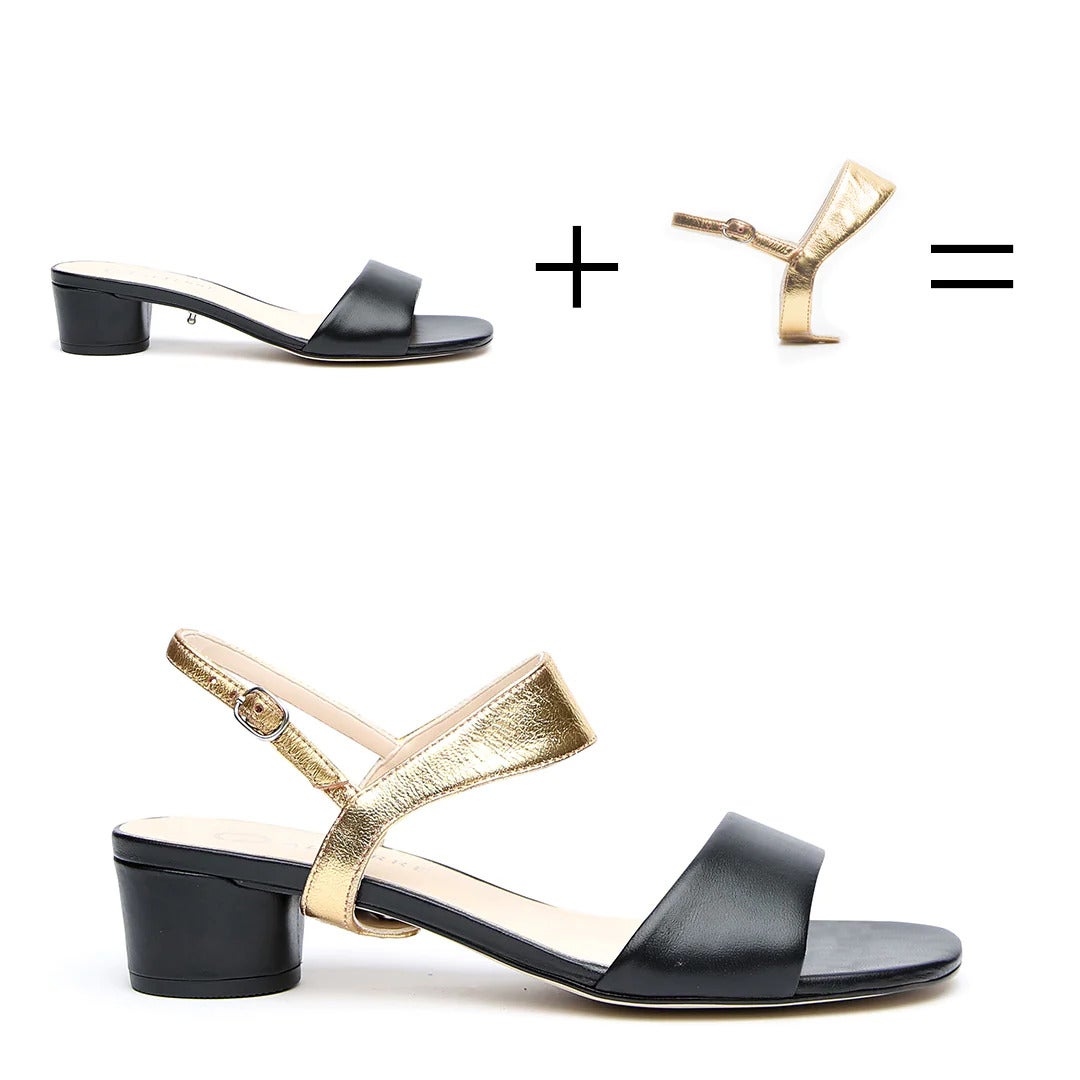 Alterre Black Sandal + Gold Elsie Strap, $, available at Alterre