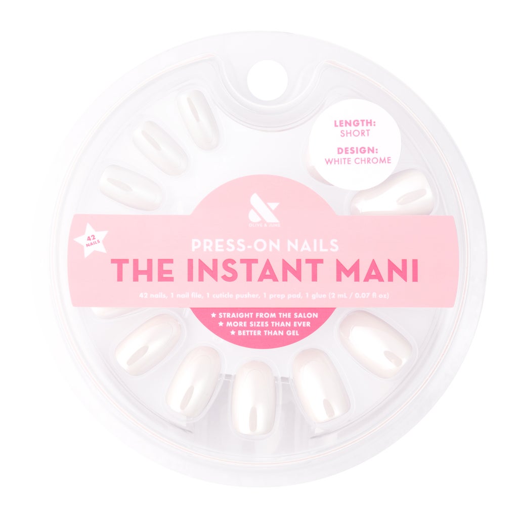 “A crisp white mani in summer is a forever favorite, but we made it even more stunning with this shimmery chrome treatment for a glazed effect,” Gibson Tuttle tells us.