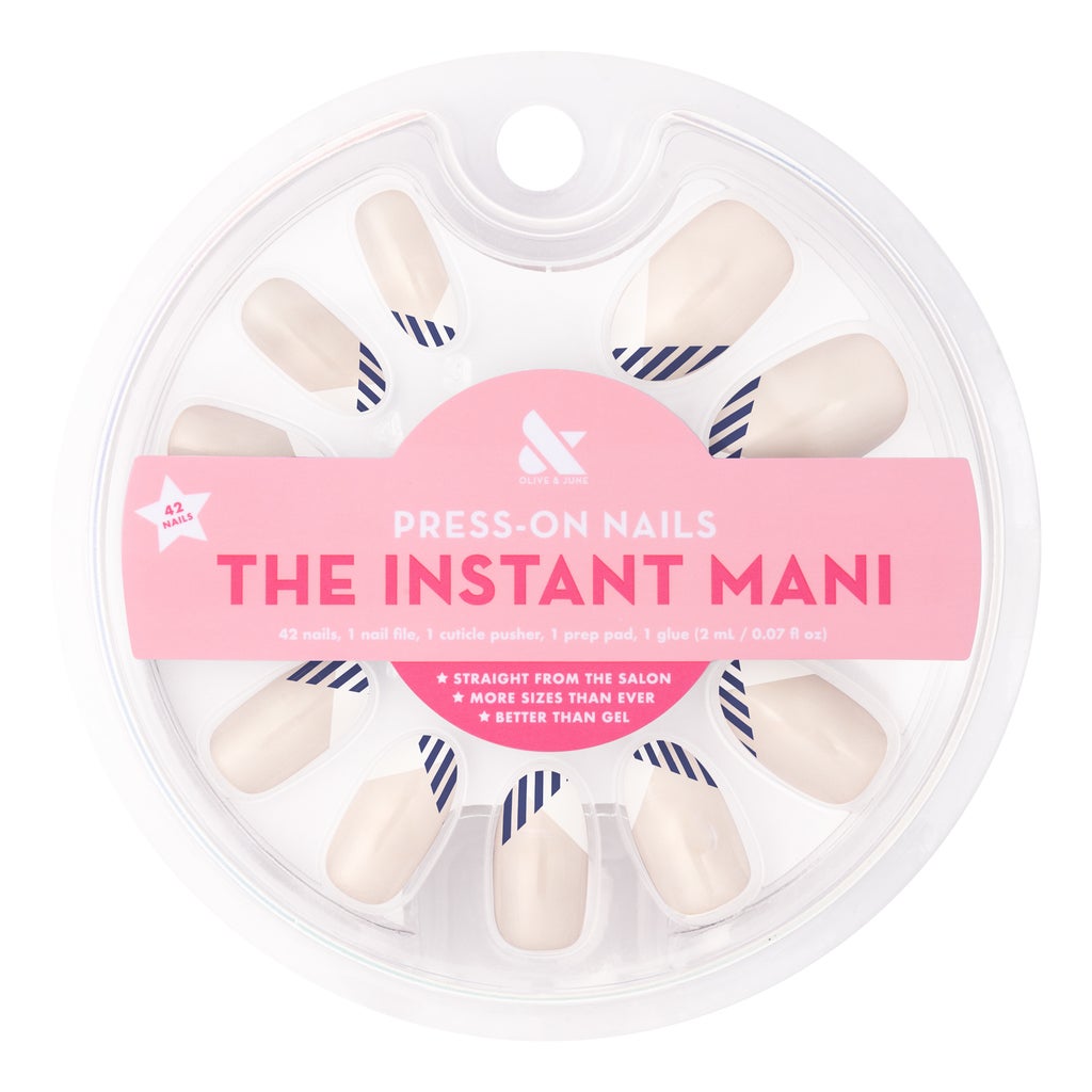 These geometric, sailor-inspired press-ons combine the wow factor of nail art with the ease (and price point) of an at-home mani. “It doesn’t get more captaincore than this,” says Gibson Tuttle. “This was an on-theme take on a classic French manicure.”