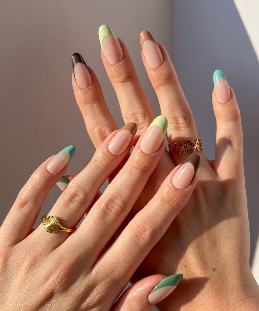 The palette for an autumnal take on colorful French tips is so wide and varied, that taking a mis-matched approach to the trend makes perfect sense. “I think a colorful French is the perfect transition from summer into autumn as it remains light and chic, but adds a touch of autumn/winter on the tip,” explains nail artist Jaz Moger. “Opt for burnt oranges, rich browns and deep greens, or go for a mixture of them all,” like this manicure by nail artist Franci.
