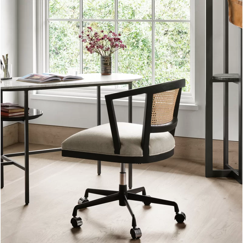 This showstopping chair has got it all: an on-trend look, ergonomic design, a brushed wood frame with natural cane inlay, a linen upholstered seat, and a swivel base.