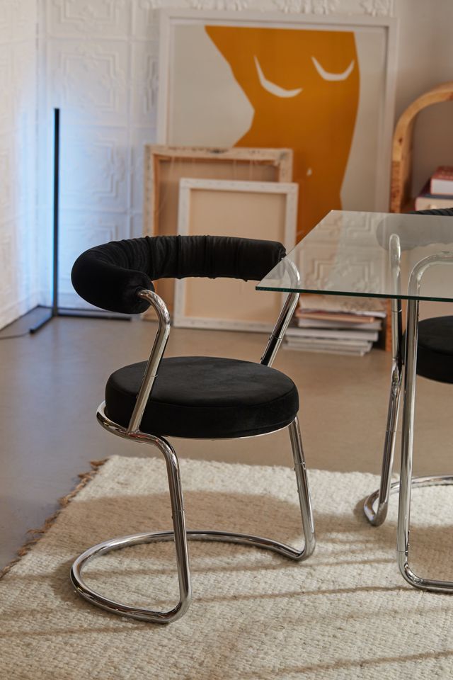 If you're working with a small space, this versatile option can be taken from desk to dining table. It features a mod tubular metal frame, a velvet seat cushion and backrest, and a funky curved silhouette.