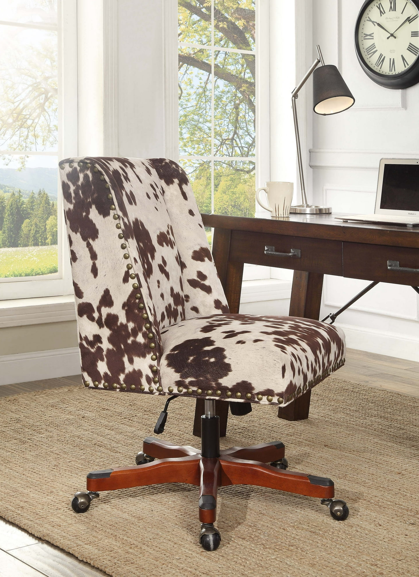 This stylish executive chair features a high back, armrests, and lumbar support. Plus, the champagne-hued velvet upholstery and wooden swivel feet make this fashionable enough to blend seamlessly into your living room decor.