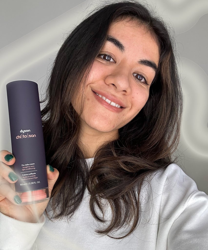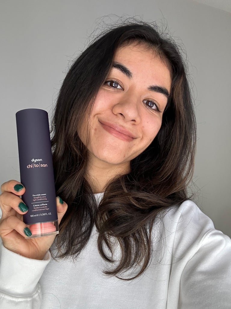 “I use only three hair products regularly — shampoo, conditioner, and hair oil — and don’t use much to set my hair, save for a bit of light hairspray. I hate the feeling of product in my hair, and a lot of cream-based products I use weigh my hair down instantly. When I style my hair, I usually prep with a heat protectant spray, but sometimes forget (I’m human!) and I’m not super loyal to any one brand or product. I liked that Dyson’s Chitosan pre-styler came in four unique formulations based on your hair type and texture — products are not one size fits all! I picked the Straight to Wavy Light Conditioning version, which was lightweight and hydrating. The bottle suggested one to two pumps to start, but since I have very thick, medium-length hair, I used four. It absorbed pretty quickly as I finger-combed it into my mid-lengths and ends.