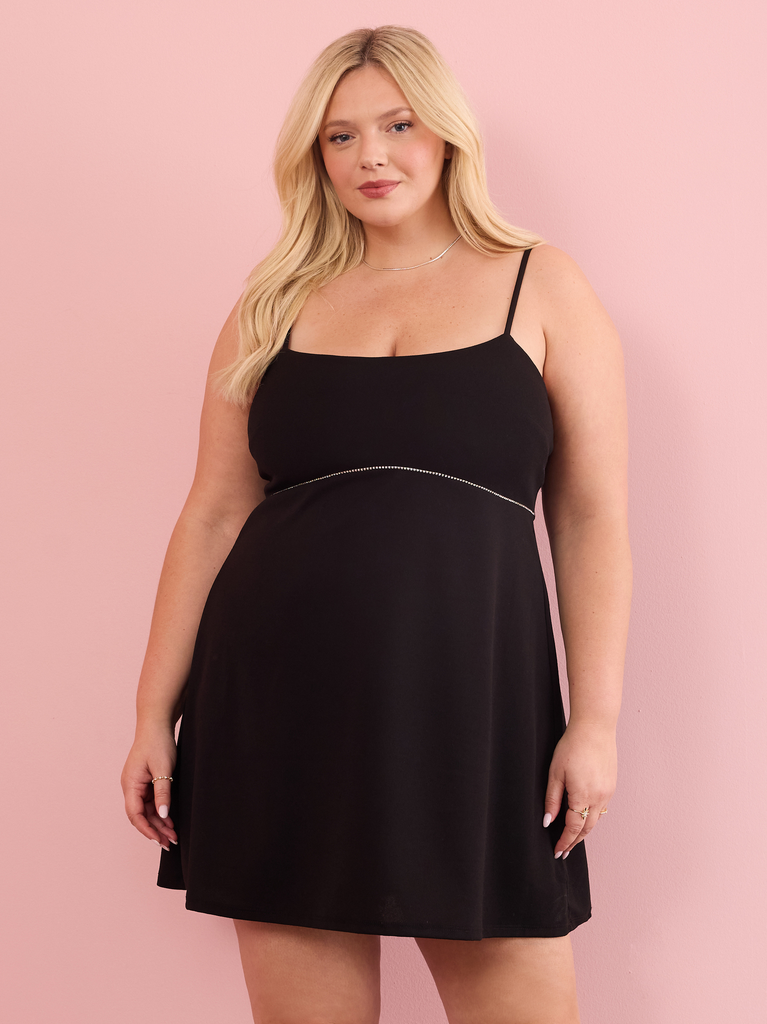 The little black dress, but make it festive: Sparkling rhinestone details and darling bow adornments give a classic a holiday-ready twist.