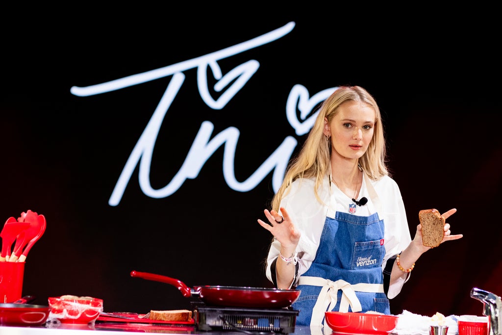 During the live demo, Younger made banana bread french toast with bananas foster and her other recipes (BBQ wings inspired by the Chiefs and Philly cheesesteak egg rolls inspired by the Eagles) were passed around to guests. I loved Younger’s energy and kindness throughout the event, taking questions from fans live about her favourite New Orleans food (she’d only tried beignets in the city so far) and who she was cheering for (she said neither, but leaning towards the Eagles). “My favorite thing about Super Bowl weekend is just seeing all the fans. Even though my team and [my husband] Antoine’s team didn’t get to the Super Bowl, I just love seeing everyone come out for the love of football.” Another thing Tini loves is getting to meet her fans who started cooking because of her. “All I want to do is get people cooking and making really good food. I’ve had a lot of people say they became a chef or joined culinary school because of me and because of the love of cooking that I helped them find. It’s very inspiring.” At just 23, Younger is already inspiring us all.