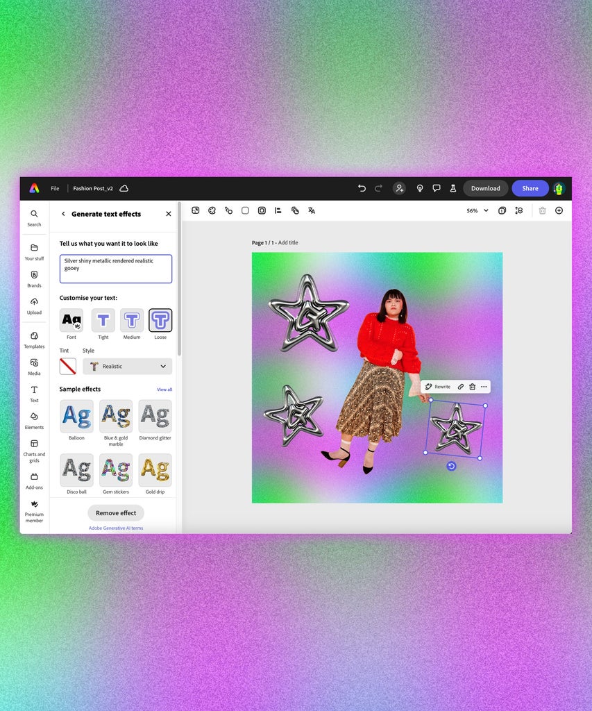 And it’s because Adobe Express takes the guesswork out of design with the best of Adobe’s pro-quality tools (like Photoshop and Illustrator) into an app that caters to all skill levels, regardless of experience. There are thousands of templates, hundreds of thousands of pro assets (Stock imagery, videos, fonts, shapes, and more), and commercially safe AI-powered tools. What that means: Adobe trains its Firefly generative AI models on Adobe Stock assets and openly licensed, public domain content where copyright has expired, meaning you won’t be infringing on anyone’s intellectual property.