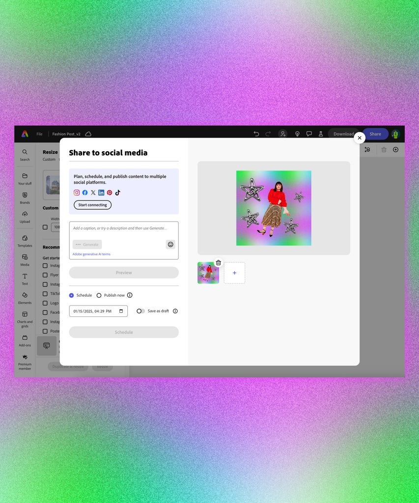 Does your Instagram grid feel lackluster? Are you struggling with low engagement? There are a few ways to make your posts stand out (and obviously, garner views and clicks): 1) Browse Adobe Express’ large library of sound effects, videos, and songs to add audio files to your posts, 2) Click Animate All to add motion to static text and images for visual interest; and 3) Maintain consistency by using Content Scheduler to queue up upcoming posts on the right channels on the right days and at right times for maximum impact. Not only can you plan, preview, and post like a boss, but you can align your content with trending moments — holidays or the latest social trend — weeks or months in advance. The content calendar also prompts fresh ideas tailored to upcoming events or trends, and it even suggests emojis and captions, so you can spend more time engaging with your audience.