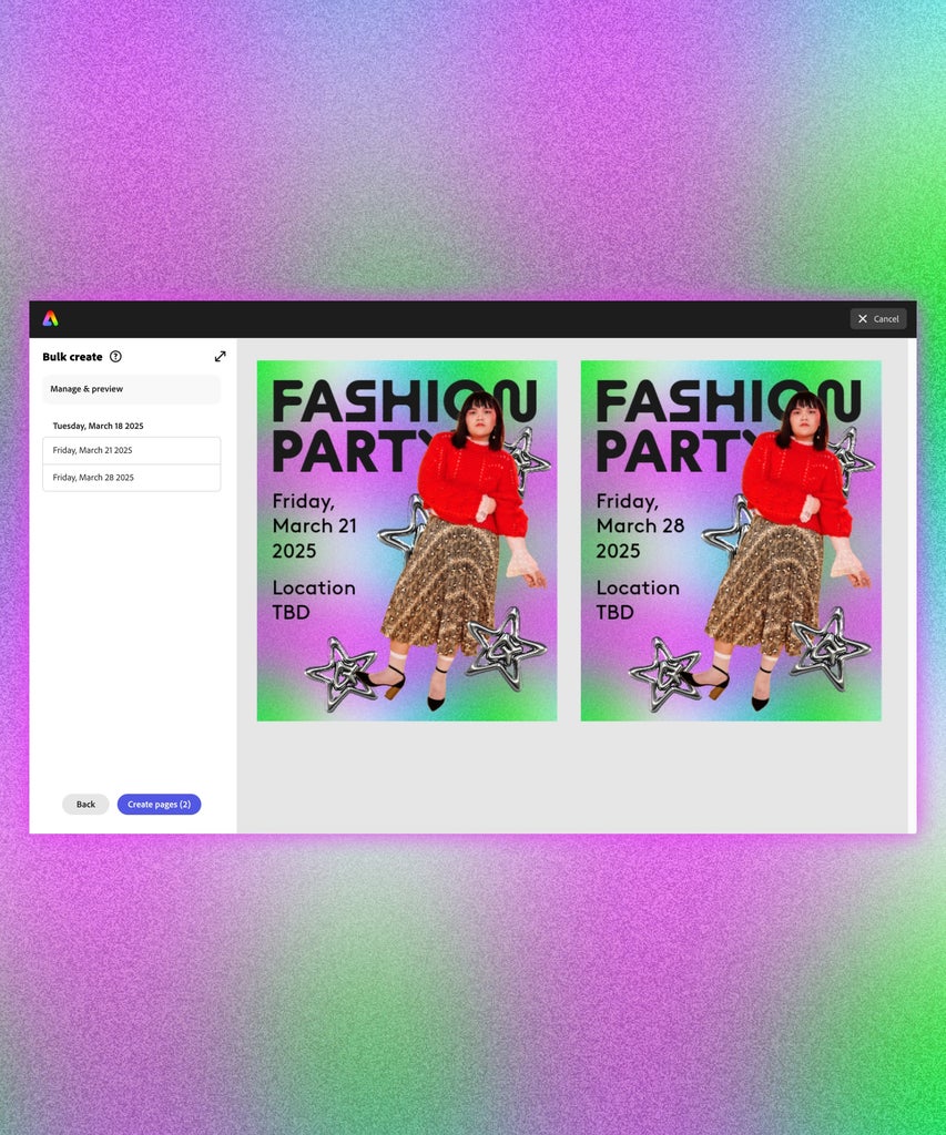 There are just not enough hours in a day, especially when you have to spend some of that precious time tediously creating similar assets. Let’s say you want to launch a series of social posts showcasing a “product of the week.” Start with a template in Adobe Express, import the image of your product, customize the text, and hit resize to resize the design for any (or every) channel or medium. And once you’ve created one, you can create all. Using Bulk Create, you can automate the creations of dozens of variations with just a few clicks.
