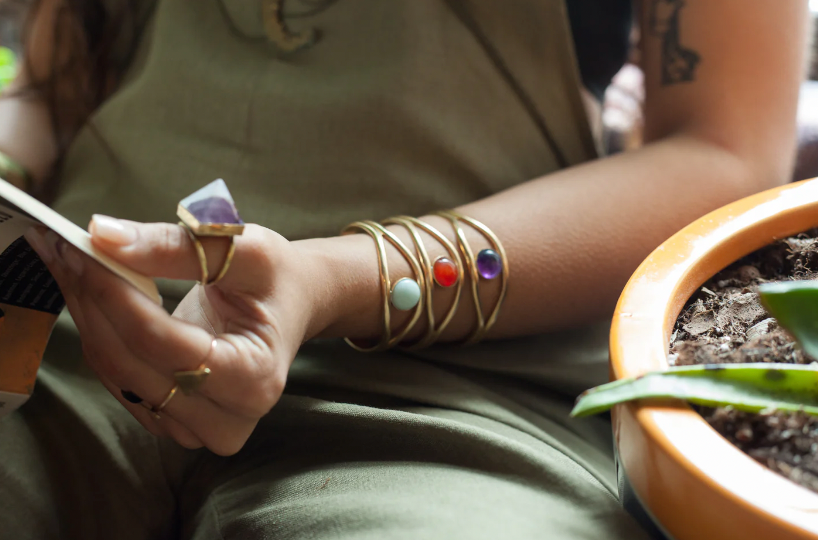 Among Luni’s top-sellers is the Mal de Ojo Bangle, crafted from raw brass and available in five gemstones, each carrying its own unique energy: Carnelian for courage and vitality, Amethyst for clarity and spiritual growth, Amazonite for peace and truth, Sodalite for intuition and emotional balance, and Tiger’s Eye for confidence and protection. The bracelet acts as a spiritual guardian, shielding your energy and protecting your spirit.