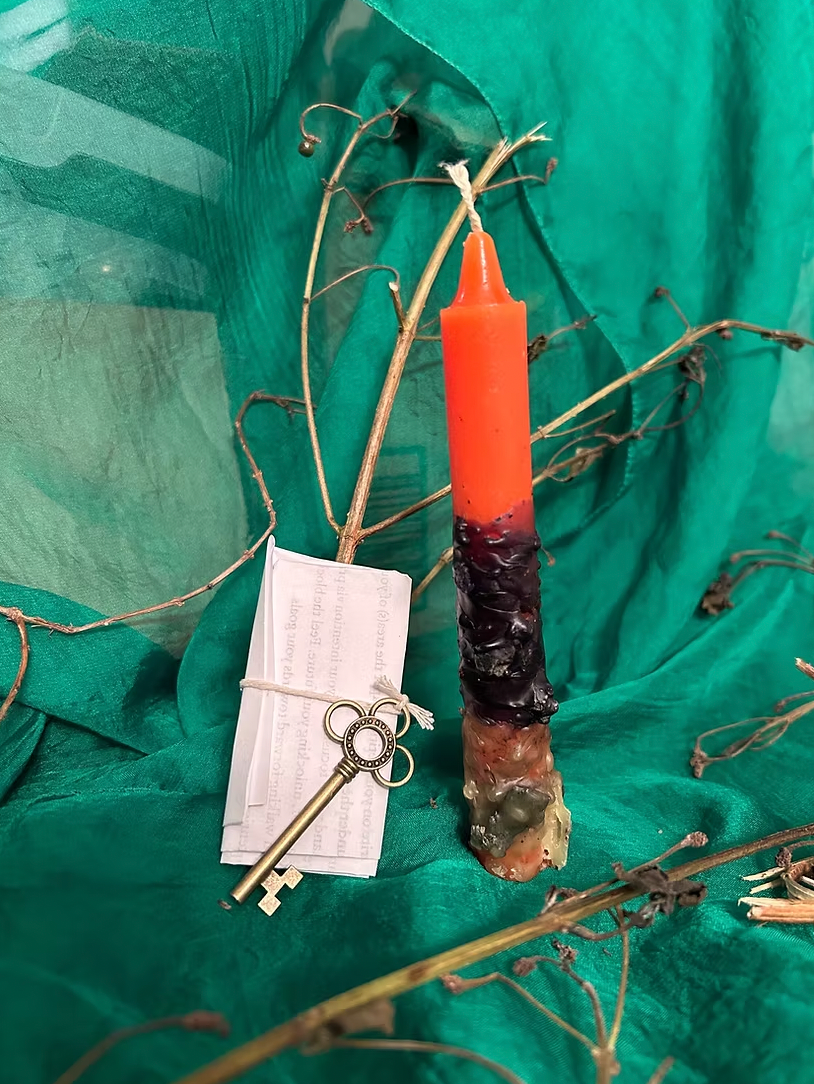 Every product — from intention sprays and spell candles to ritual tools and accessories — is handcrafted and spellcast by Branco, who is also an award-winning artist. Among the brand’s best-selling offerings is the Cleanse & Protect Set, which includes a candle, spray, and oil made from sage, rosemary, palo santo, and clove essential oils, all charged to clear your space and protect against negative energies. For those looking to open their path this season, the Abre Camino Spell Candle — a red candle accompanied by a key and ritual instructions — is designed to unblock blessings and invite prosperity, love, and success.