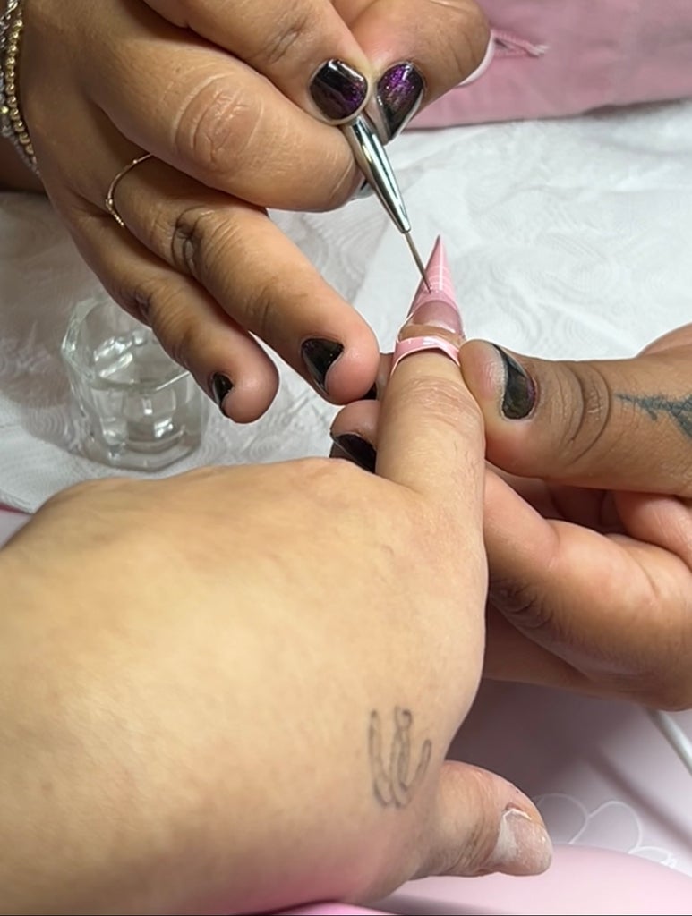 For my second builder gel mani, Olive & June graciously set me up with an appointment with manicurist Julieta Martinez. Martinez walked me through the steps of using the Olive & June nail forms, which come in three sizes to fit your finger and create a customized extension. (If you’ve never tried nail forms before, they work by wrapping around your finger and painting on the builder gel in your desired length and shape.)