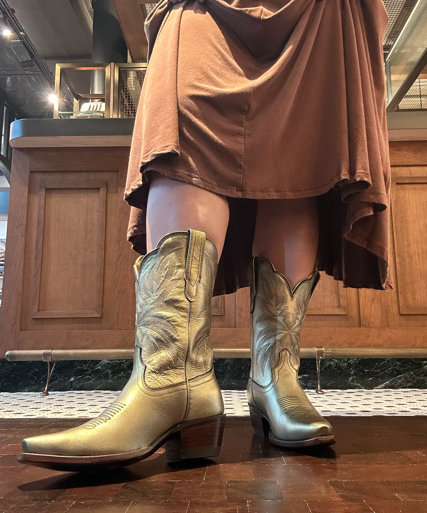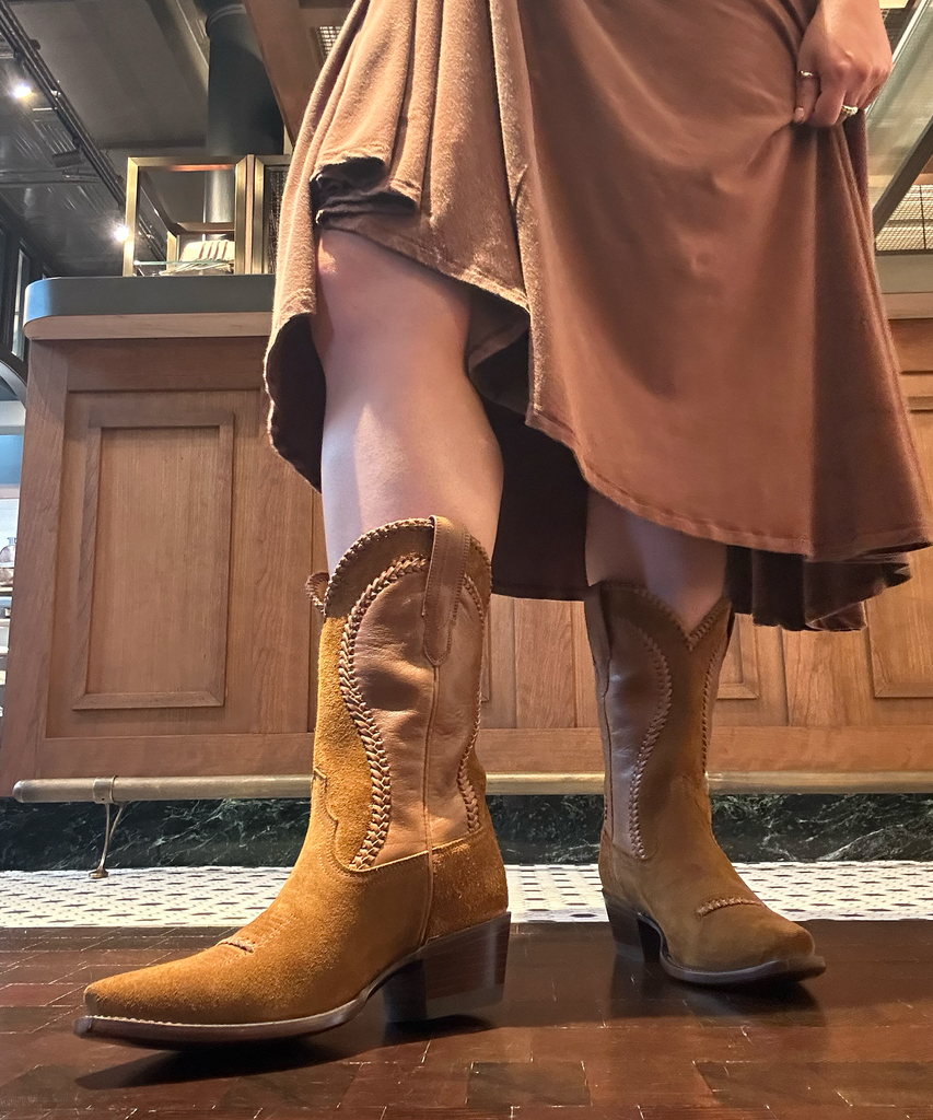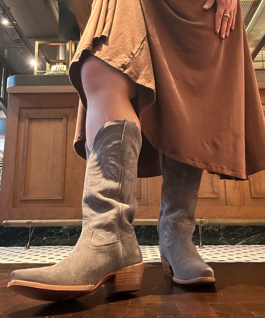 Now, onto the boot I couldn’t wear: The Abigail. I generally have to order wide-calf boots for myself, so I was skeptical about trying the brand’s knee-high and over-the-knee styles. While The Annie is offered in wide-calf options, others are not, so I couldn’t quite slip The Abigail all the way up. But pro tip: every Tecovas store offers free boot stretching. I witnessed this service in person when a worker stretched the shaft of a boot up to an extra inch wider. This is a huge perk if you’re able to make it into a store so that your boots fit perfectly.
