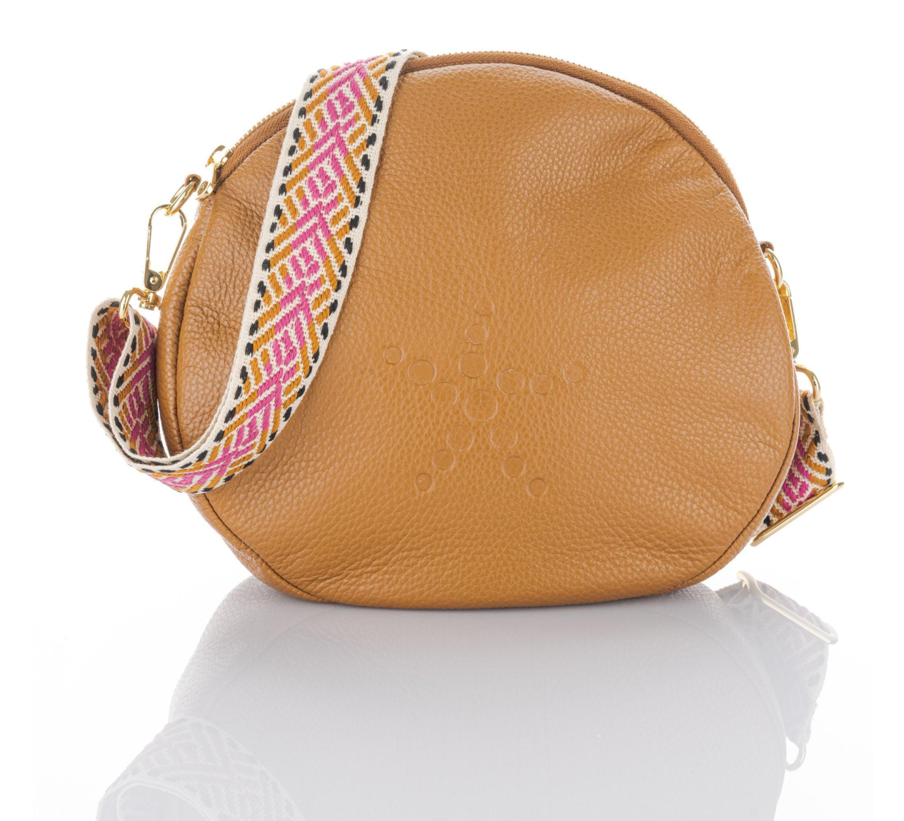 Vita Isola Vita Isola's Alondra Leather Round Crossbody in Camel, $, available at Vita Isola