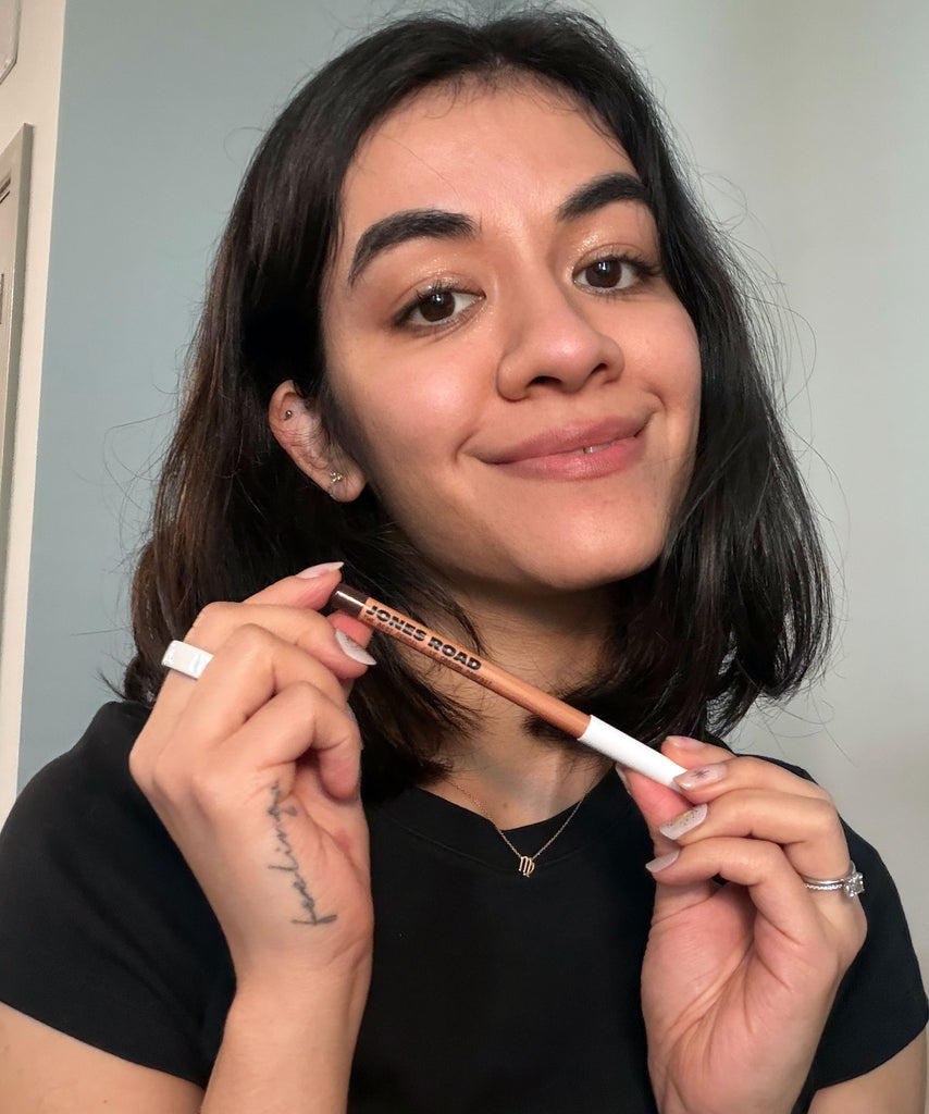 Eyeliner is one of my favorite products to use, whether I’m doing a cat-eye, tight-lining my upper waterline for a smudged, smoky effect, or adding a pop of color with a bright blue or bright white. A black pencil is a staple, so I wanted to see how Jones Road’s stacked up. It’s challenging — borderline impossible — to achieve an intense, inky black with a “clean” product due to the absence of carbon pigments typically found in conventional black eyeliners. Thus, I wasn’t surprised that Jones Road’s pencil came out as soft black. Using small strokes, I lined the outer corner of my eyes and blended it out to create the littlest wing. (I almost never line my entire lash line since it can make my eyes look smaller.) For subtle definition, this pencil gets the job done, and I appreciate that it’s a clean formula safe for the delicate eye area. However, if you’re after a dramatic, long-wear, or waterproof formula, this might not be the best choice.